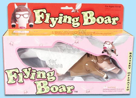 617/1 Flying boar. 8.5" boar that flies around in a circular motion on a string with flapping wings. Requires 2 "AA" batteries (not included). box size: 11.25L"x2.75"Wx8"H.