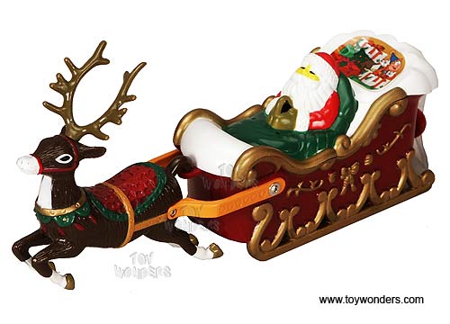 9211PO Flying Santa Sleigh. This Santa Sleigh is 8.75" long. Hanging on the ceiling, it flies around in a circular motion on a string and plays X' mas melodies. Great for Christmas decoration. Uses two "AA" batteries (not included). Box size: 12.5"L x 3.25"W x 4"H. 12 pcs per inner.