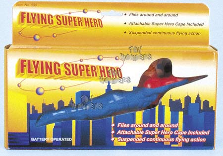 595 Flying Super Hero. 8.5" battery operated flying super hero. This fearless super action hero flies around in a circular motion on a string. Requires two "AA" batteries (not included). Box size: 7.75"Hx11"Wx3.25"D.