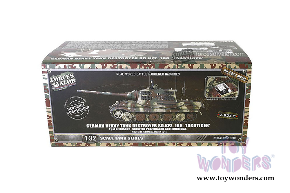 Forces of Valor - German Heavy Tank Destroyer Sd.Kfz.186 Jagdtiger (With Henschel suspension & Road Wheels) (1/32 scale diecast model car, Camouflage Forest) FOV-801024A