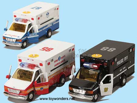 18038D Ford E-350XL Type III - Emergency Version with sound & light. 1:43 scale diecast model. This ambulance is a 5.5" long diecast with pullback motor action. This emergency IC vehicle has opening doors. Tins' Metal. 12 pcs per display box and in 3 styles: Fire Department, Police Department, and Paramedic Services. 48 pcs per inner box.