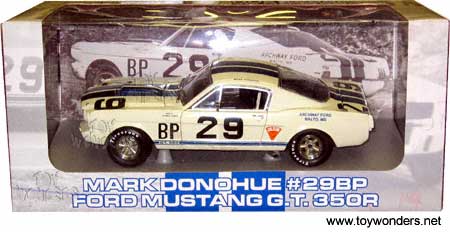 1102W GMP. Ford Mustang GT-350R (1965) Limited Edition 1 of 2,004 pcs Scale: 1:18 '65 BP #29 Mark Donohue / Macomb Star GT350R. Wimbledon White exterior with blue stripes and black interior.