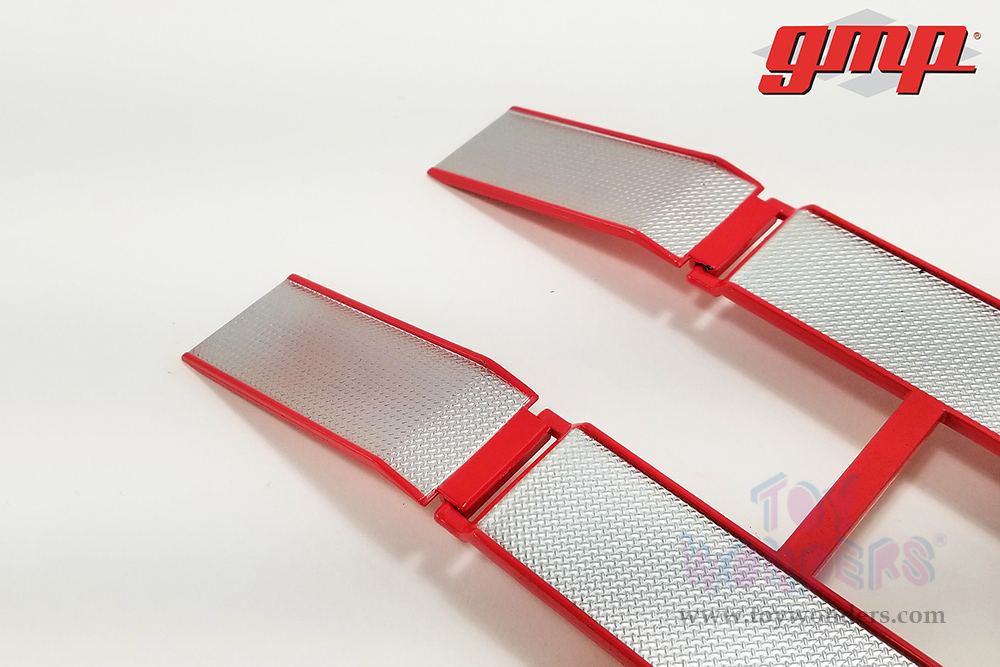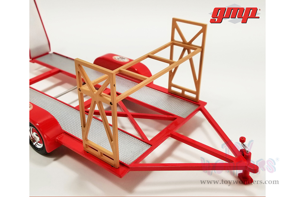 18963 GMP - Busted Knuckle Garage Tandem Car Trailer with Tire Rack. Scaled for 1:18 scale model cars or 1:18 scale dioramas. This exclusive Trailer is 13"L x 6.25"W x 1.75"H with extra hitch extensions, optional tire rack, position jack stand and removable poseable ramps. Box size: 14"L x 14"W x 2"H. Manufactured by Greenlight. Note: This trailer not a direct fit on all 1/18 scale models.