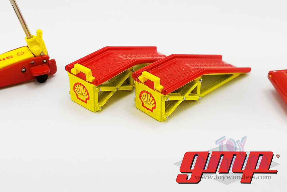 18950 GMP - Shop Tool Set #2 - Shell Oil. Scaled for 1:18 scale model cars or 1:18 scale dioramas. This exclusive Shop Tool Multipack includes: Floor Jack, 2 Ramps, Creeper, Oil Catch Pan & Oil Bottles, Jack stands. Box size: 9"L x 8.5"W x 2"H. Manufactured by Greenlight.