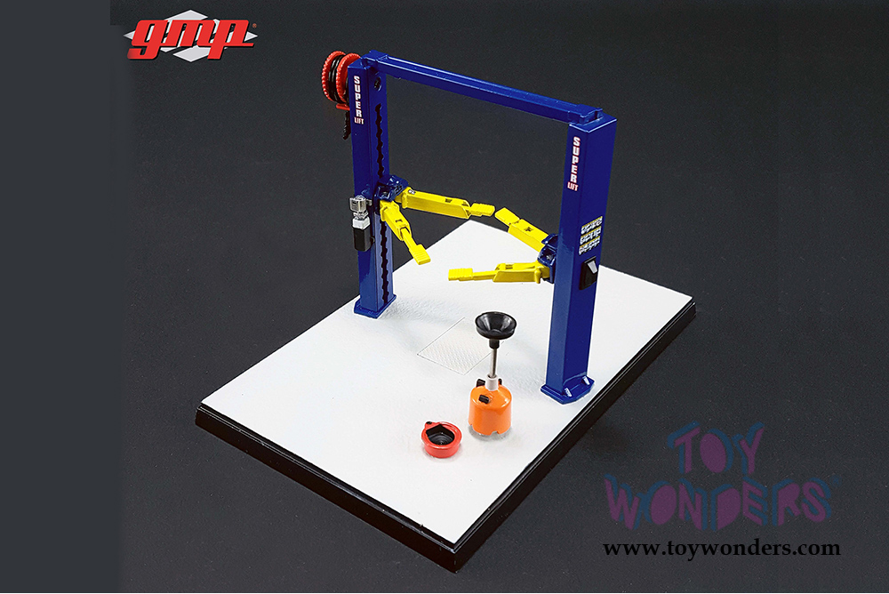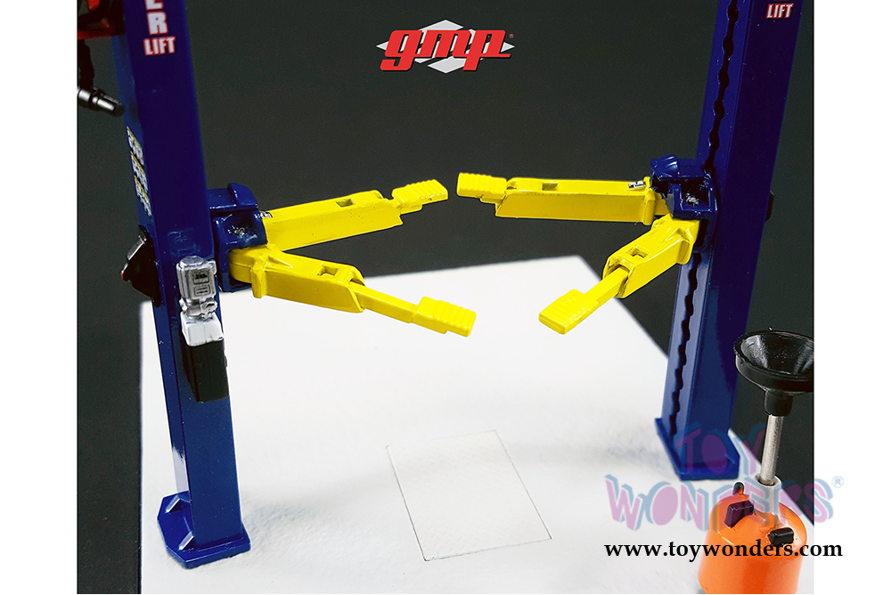 14301 GMP- Two Post Lift. Scaled for 1:43 scale model cars or 1:43 scale dioramas. This exclusive accessory includes: