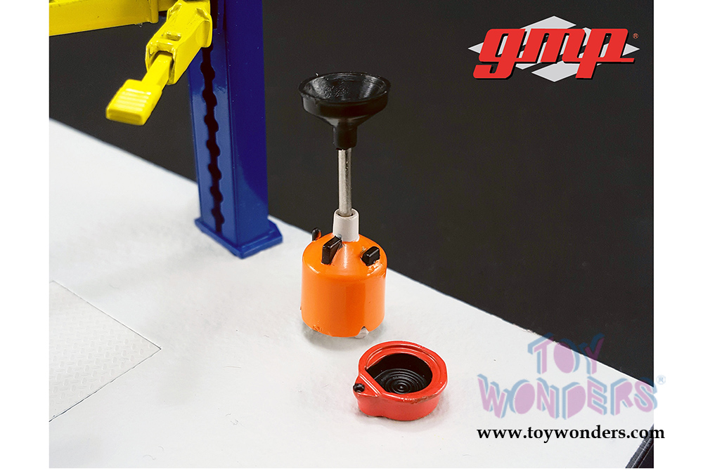 diecast metal frame and arms, 2 oil catch pans included, base included. Box size: 7"L x 5"W x 2"H.  Manufactured by GMP. Item 14301 is in BLUE and YELLOW colors.