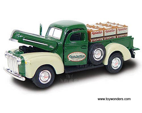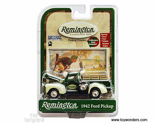 56952 Gearbox Remington - 1942 Ford Pickup Truck with Crates. 1:43 scale diecast collectible model car. This Ford pick-up truck is a 4.5"Lx 1.5"Wx 1.75"H die cast metal car with openable hood, doors & tailgate. This 42 Ford pick up truck is manufactured by Gearbox Toys Collectibles. 56952 is in GREEN color. Each car individually blister carded. Card size: 5.5" x 7.75".