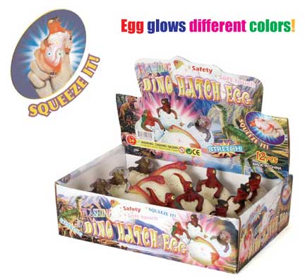 TW249 Dinosaur eggs that glow and flash different colors when you give them a squeeze. 4 asstd. dinosaur eggs: tyrannosaurus Rex (T-Rex), brachiosaurus, triceratops, and velociraptor. Each egg is soft and squishy. 12 eggs per display box. Each counter display box measures: 10.25"L x 7"Wx 2.75"H (header not included).