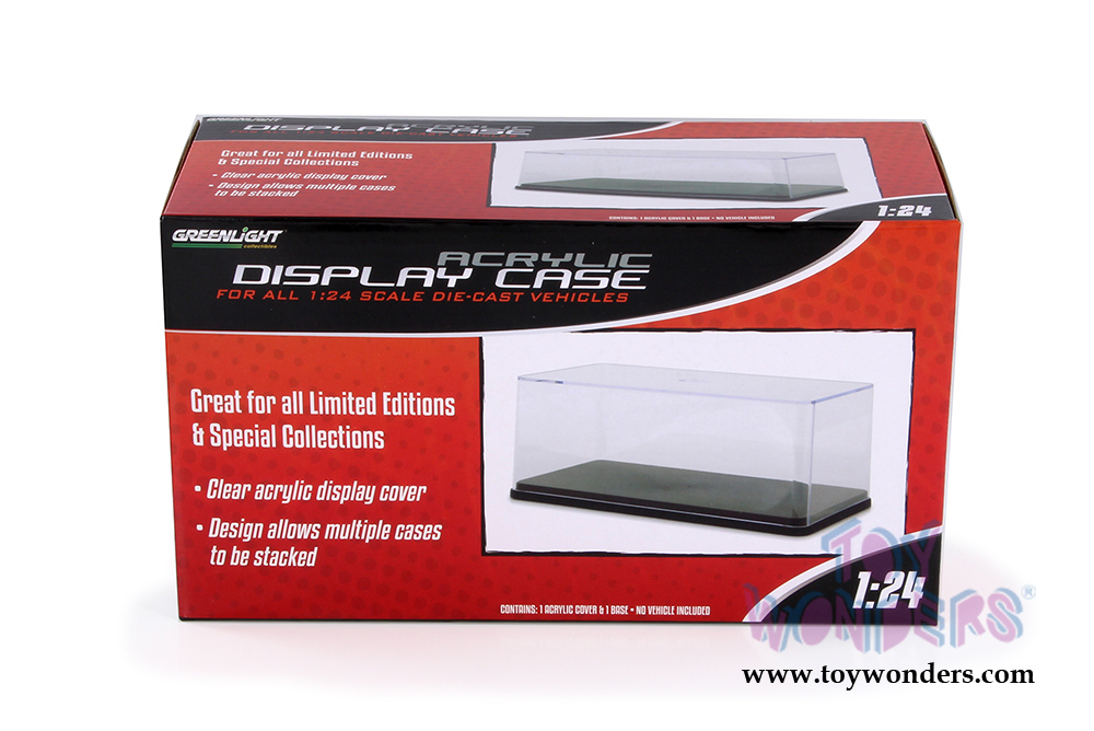 55024 Greenlight Acrylic Display Case. It features displaying a 1:24 scale vehicle with clear sides and top. Clear acrylic display cover, design allows multiple cases to be stacked. Show case measures 9.5"Lx 5"Wx 3.75"H. This accessory is manufactured by Greenlight.