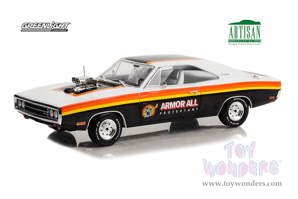 Greenlight - Artisan Dodge Charger with Blown Engine - Armor All (1970, 1/18 scale die cast model car, Black/White with Orange and Yellow stripes) 19123