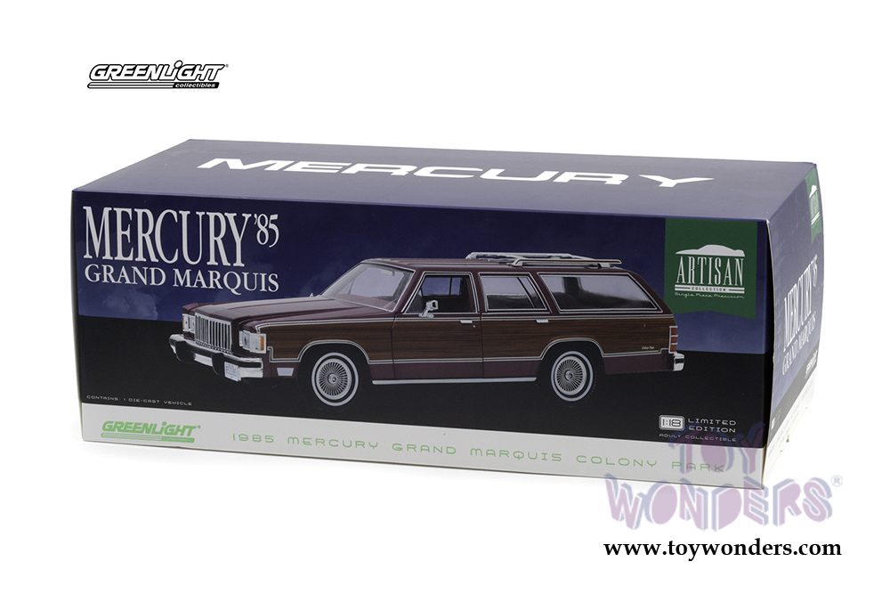 19093 Greenlight - Artisan 1985 Mercury Grand Marquis Colony Park. 1:18 scale diecast collectible model car. This Grand Marquis is a 12.25"L x 4.25"W x 3"H diecast metal car. Freewheeling with openable doors. Detailed interior, exterior. The Plymouth is manufactured by Greenlight. Individually packed in a box. Box size: 13.75"L x 6.75"W x 5.5"H. 19093 is in Burgundy with Wood Grain Paneling.