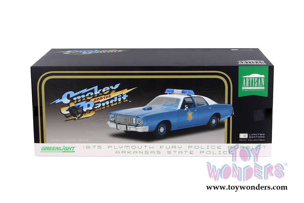 19044 Greenlight Artisan 1975 Plymouth Fury Police Pursuit Arkansas State Police "Smokey and The Bandit™" (1977) Movie. 1:18 scale diecast collectible model car. This 1975 Plymouth is 11.5" Long. Authentically detailed replica. Made of heavy weight diecast metal and plastic. This Police car is manufactured by Greenlight. 19044 is in BLUE color with white roof. Individually packed in a box. Box size: 14.5"L x 6.75"W x 5.5"H.