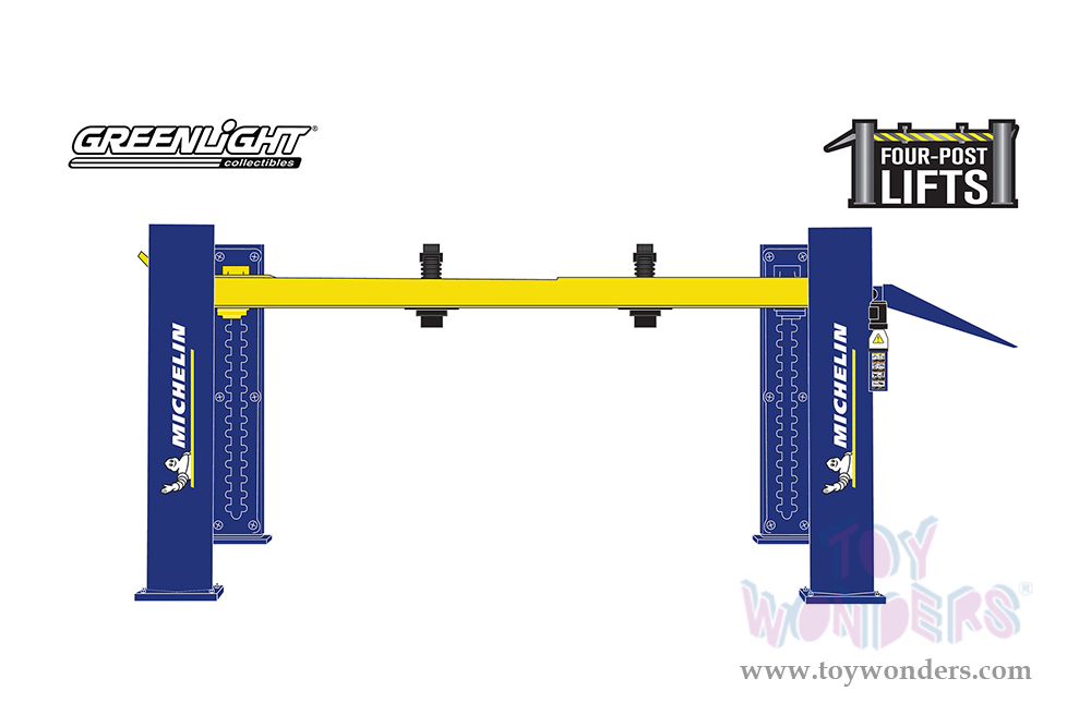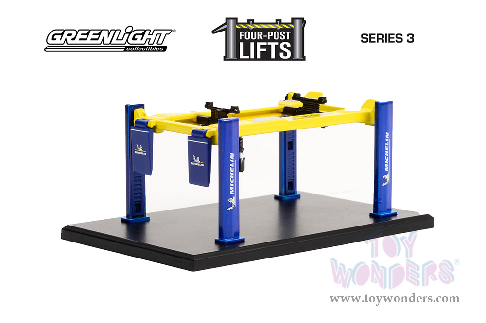 Greenlight - Auto Body Shop - Four-Post Lifts Series 3 - Michelin Tires (1/64 scale diecast model, Blue/Yellow) 16130B/48