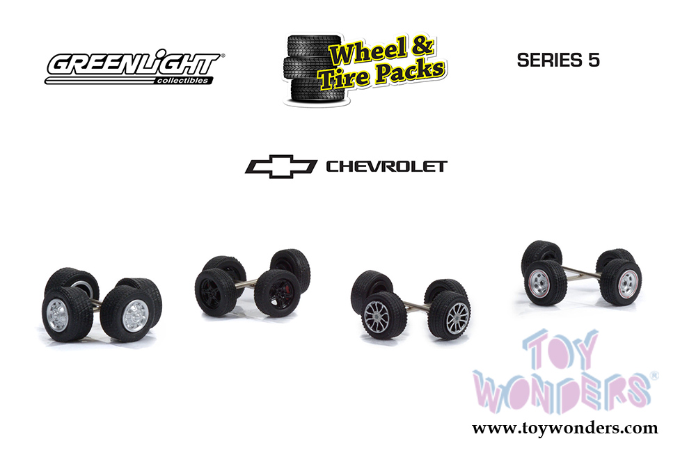 16090A/48 Greenlight - Auto Body Shop - Wheel & Tire Packs Series 5 | Chevrolet® Corvette®. 1:64 scale rubber tires multipack. This set includes 16 wheels, 16 tires and 8 axles. Diameter of each wheel approximately: 0.5" Individually packed in a blister card. Card size: 7.5" x 5.75". This accessory is manufactured by Greenlight. 6 sets per inner.