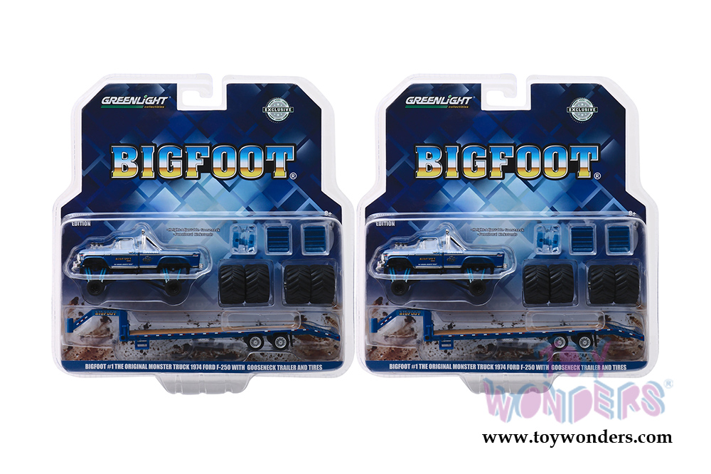 Greenlight - BIGFOOT® #1 The Original Monster Truck Ford F-250 Pickup with Gooseneck Trailer and 66" Tires replacement set (1974, 1/64 scale diecast model car, Blue) 30054/48