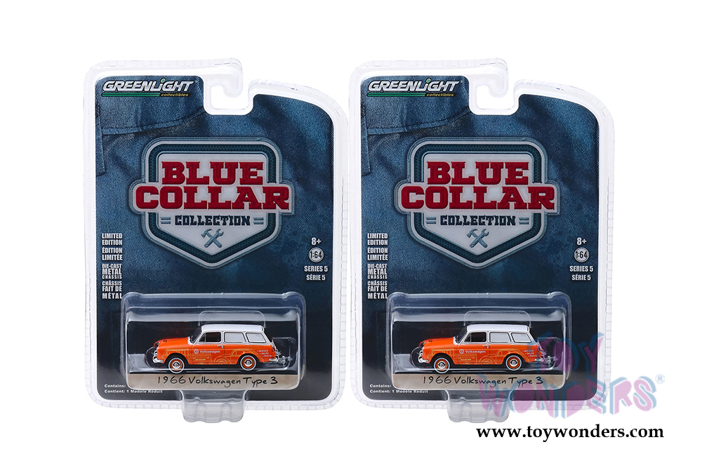 35120C/48 Greenlight - Blue Collar Collection Series 5 | 1966 Volkswagen Type 3 Panel Van - Volkswagen Sales and Service (six-piece set). 1:64 scale diecast collectible model. This VW Van is a 2.75" long diecast metal car. Each car individually blister carded. Card size: 7.5" x 5.5". 6 pcs/inner. Manufactured by Greenlight. 35120C/48 is in ORANGE color with white roof.