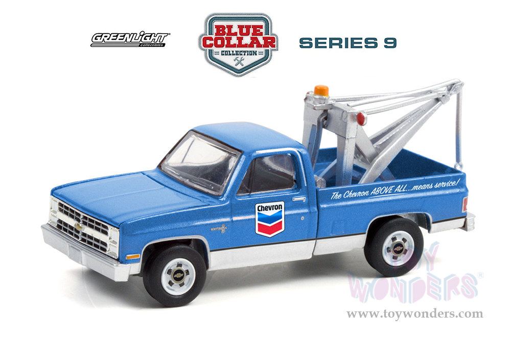 Greenlight - Blue Collar Collection Series 9 | Chevrolet® C20 Scottsdale with Drop-In Tow Hook - Chevron (1983, 1/64 scale diecast model car, Blue/White) 35200D/48