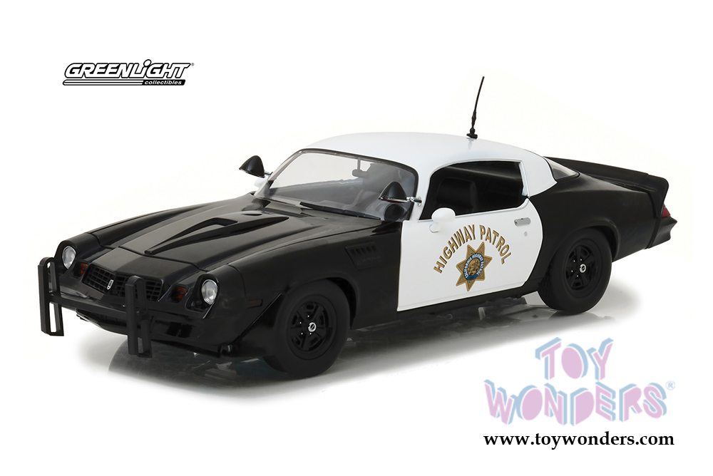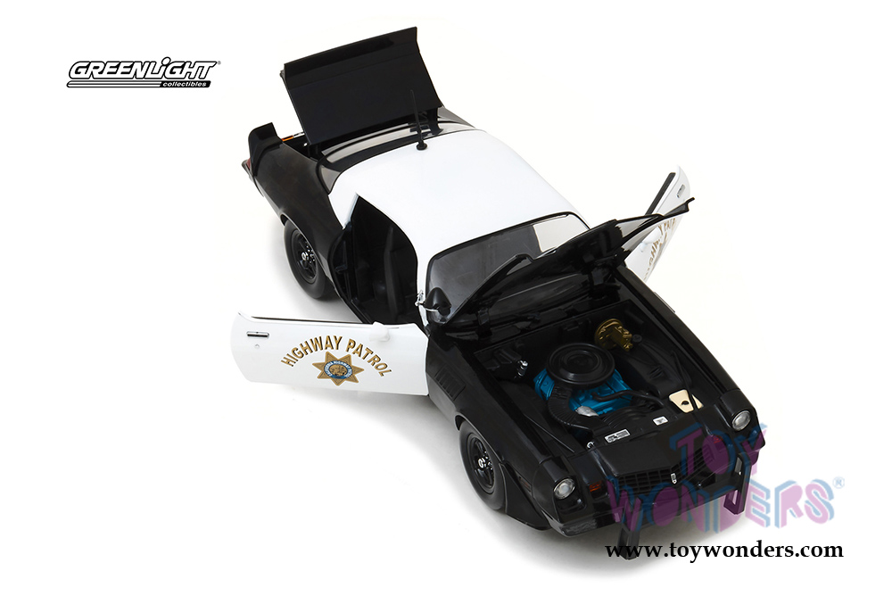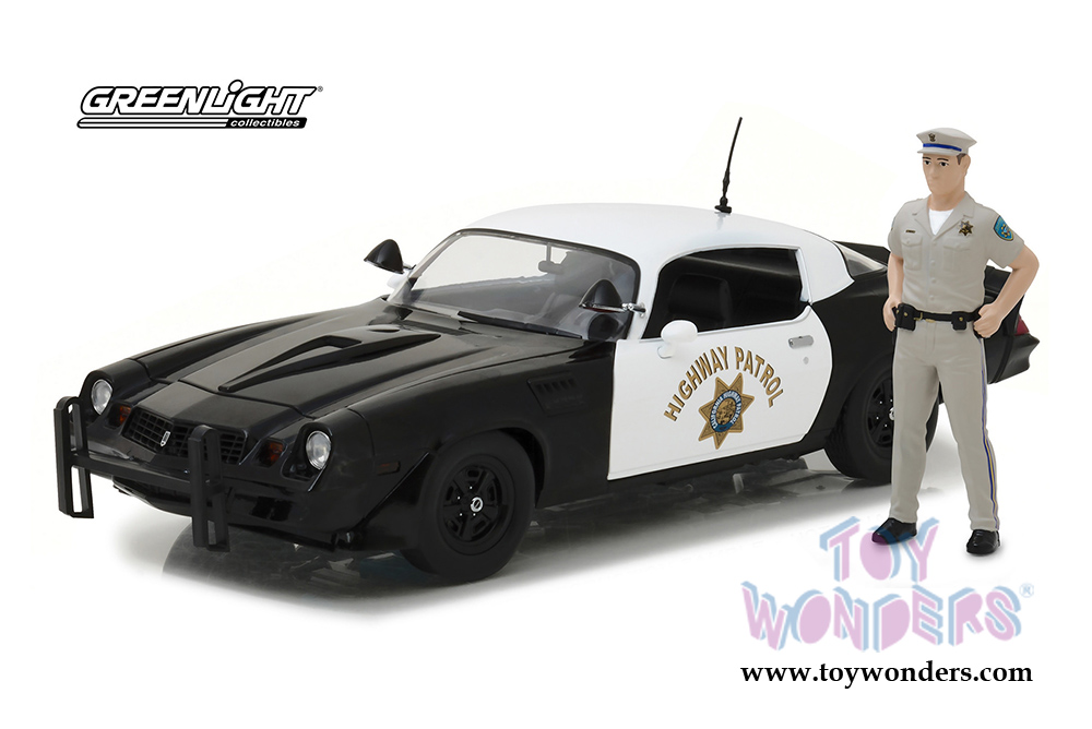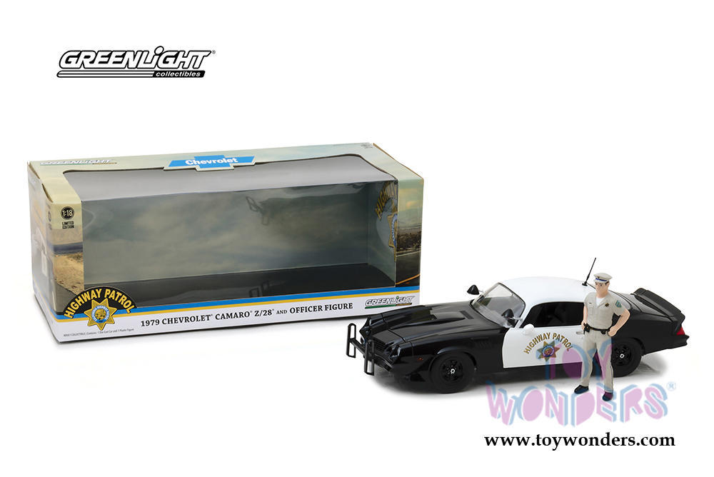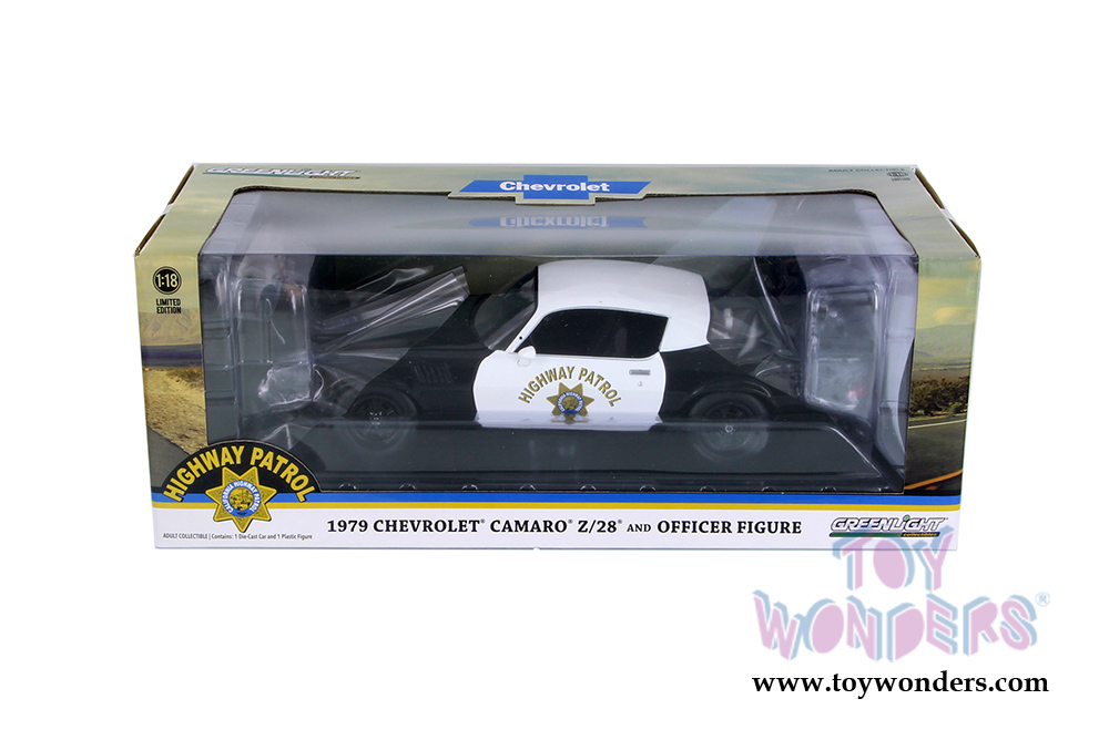 Greenlight - Chevrolet Camaro Z/28 California Highway Patrol Hardtop (CHP) with Police Officer Figurine (1979, 1/18 scale die cast model car, Black/White) 13506