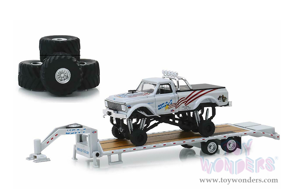 Greenlight - Chevrolet® K-10 "USA-1" Monster Truck on Gooseneck Trailer with Regular and 66" Tires replacement set (1970, 1/64 scale diecast model car, White) 30101/24
