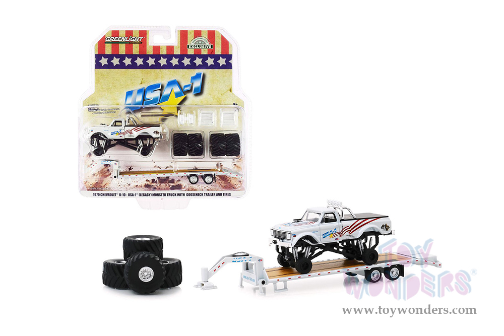 30101/24 Greenlight - 1970 Chevrolet® K-10 "USA-1" Monster Truck on Gooseneck Trailer with Regular and 66" Tires replacement set. 1:64 scale diecast collectible model. This Chevy® monster truck is about 3.5" long. Goose-neck Trailer is 7.25" Long die cast metal car. Individually blister carded. Card size: 8" x 8". 12 pcs/inner. Manufactured by Greenlight. 30101/24 is in white.