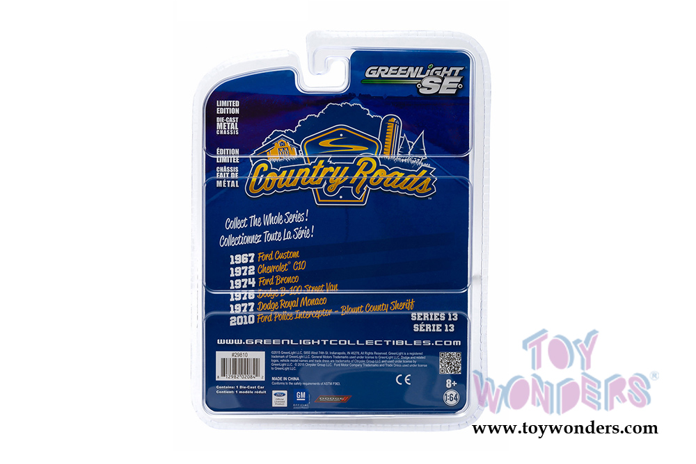 29810/6 Greenlight - Country Roads Series 13. 1:64 scale diecast collectible model. These cars are about 3" long die cast metal cars. Each car individually blister carded. Card size: 5.75" x 7.75". 6 pcs/inner. Manufactured by Greenlight. 29810/6 is in assorted styles and colors.
