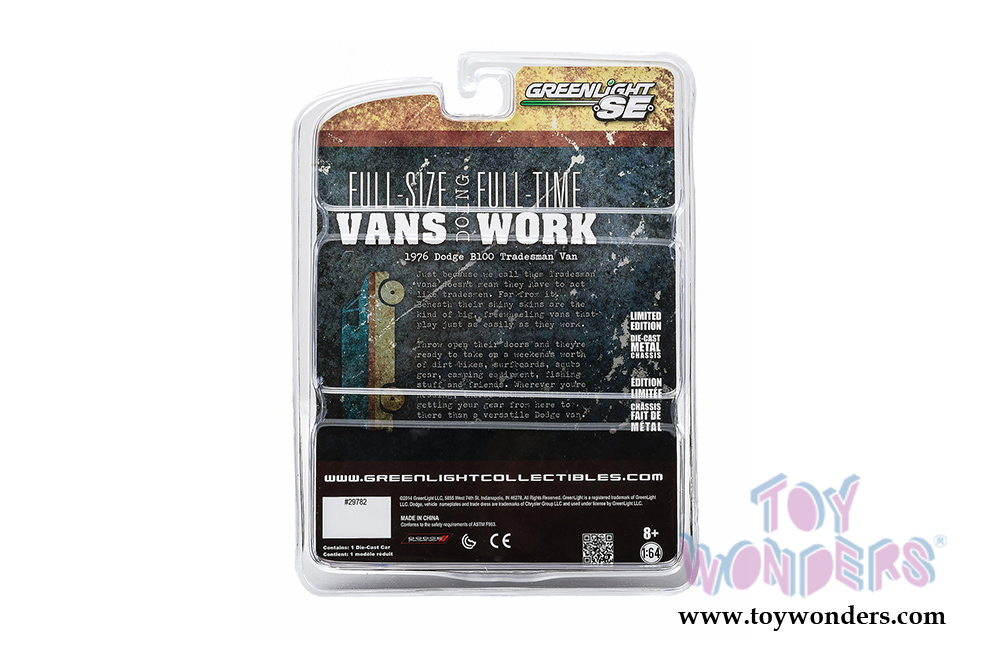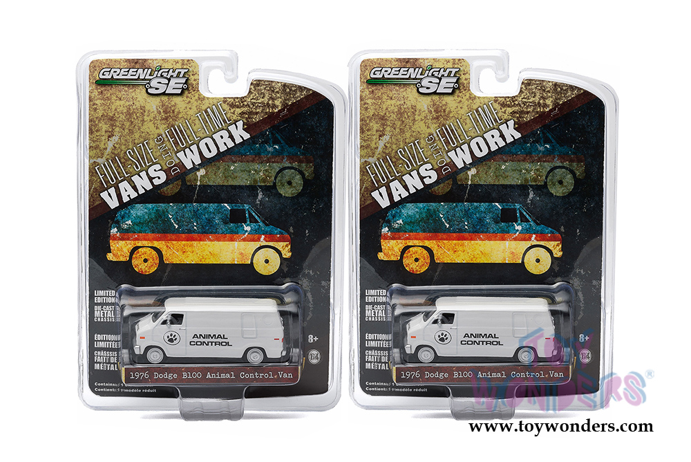 29782/48 Greenlight - 1976 Dodge B-100 Van Animal Control. 1:64 scale diecast collectible model. This Van is a 3"L x 1.25"W x 1.25"H long diecast metal car. Each car individually blister carded. Card size: 5.25" x 7.5". 12 pcs/inner. Manufactured by Greenlight. 29782/48 is in WHITE.