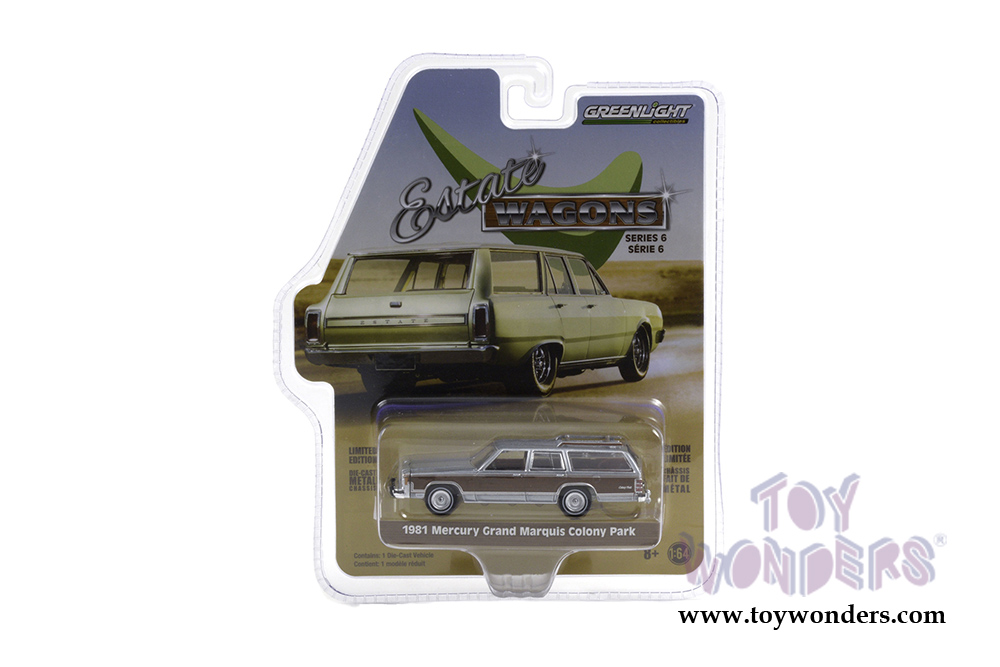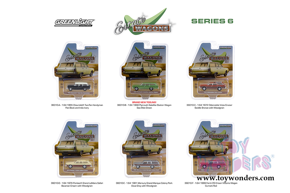 36010/48 Greenlight - Estate Wagons Series 6. 1:64 scale diecast collectible model car. These wagons are between 2.5" and 3" long. Limited Edition. Each car individually blister carded. Card size: 7.5" x 6". These cars are manufactured by Greenlight. Item 36010/48 comes in assorted colors and styles.