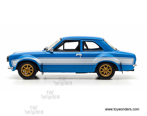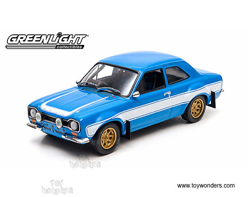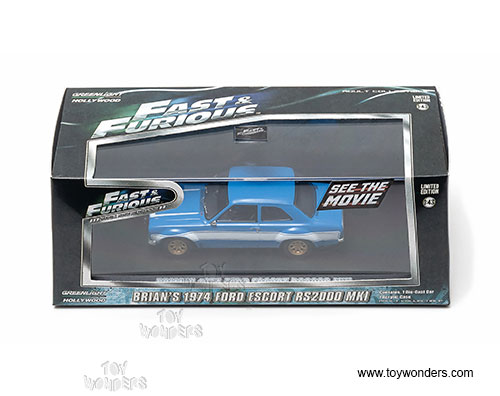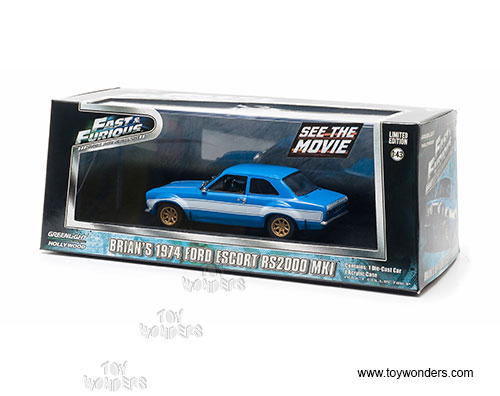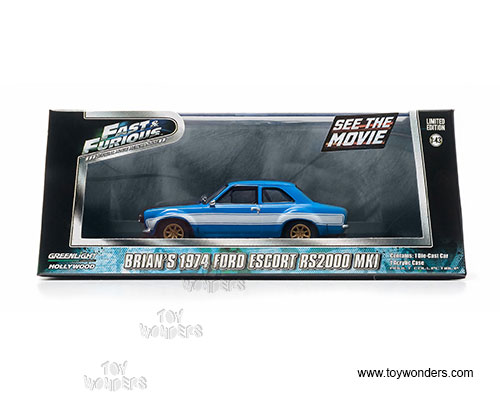 86222 Greenlight Fast & Furious - Brian's 1974 Ford Escort RS2000 MKI Hard Top. 1:43 scale diecast collectible model car. This 74 Ford Escort is a 3.5"L x 1.5"W x 1.25"H diecast collection car. This  Ford Escort RS2000 MKI is manufactured by Greenlight. Limited Edition, adult collectible. 86222 is in BLUE with white stripes. Individually packed in a hard plastic case. Case size: 7.25"Lx 3.25"Wx 2.75"H.