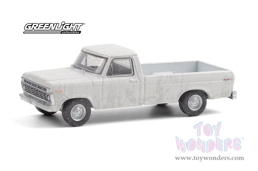 30217/48 Greenlight - 1973 Ford F-100 Pickup Truck - Dukes of Hazzard Uncle Jesse's Truck (12 pcs. set). 1:64 scale diecast collectible model car. These trucks are about 3.25" long. limited edition. Each car individually blister carded. Card size: 7.5" x 5.5". These cars are manufactured by Greenlight. Item 30217/48 comes in White Weathered.