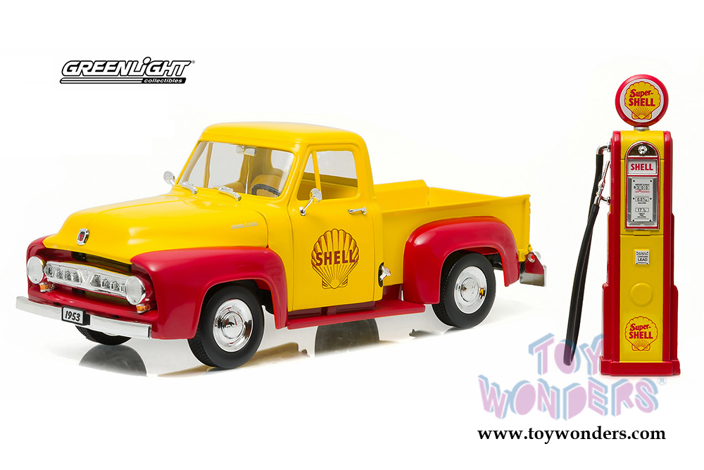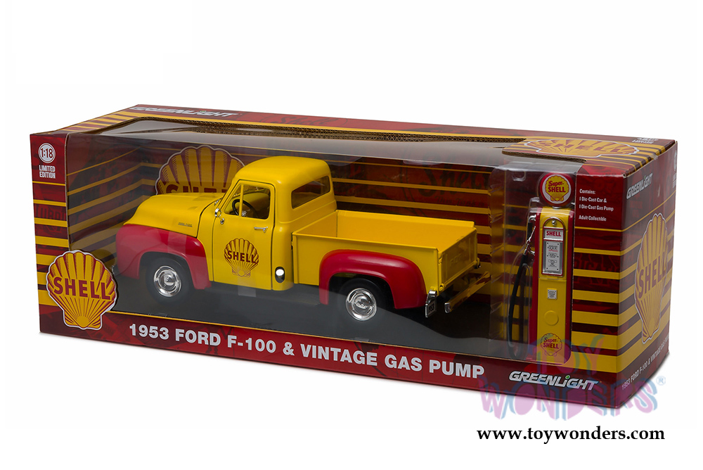 12983 Greenlight - 1953 Ford F-100 Pickup Truck Shell Oil with Vintage Gas Pump. 1:18 scale diecast collectible model car. This Ford F100 is a 10.5"L x 4"W x 4"H die-cast collection car with openable doors, hood and tailgate. Pump is approximately 5.25 inches high. Limited edition. This pick-up truck is manufactured by Greenlight. Item 12983 is in YELLOW color with Red. Individually packed in a window box. Box size: 17.5"L x 6"W x 6"H.