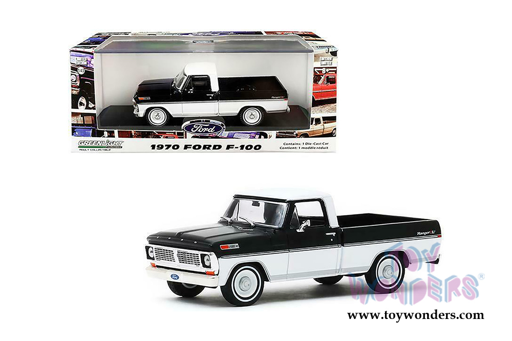 86338 Greenlight - 1970 Ford F-100 Ranger XLT Pickup Truck. 1:43 scale diecast collectible model car. This Ford F100 is a 4.25"L x 1.75"W x 1.75"H authentic detailed replica. Made of heavy weight diecast metal and plastic. Updated wheel tooling, authentic decoration, chrome accents, true-to-scale detail, and acrylic case.  Limited Edition. Sits on a display plaque. This '70 Ford Pickup Truck is manufactured by Green Light. Item 86338 is in Raven Black with Pure White. Individually packed in a window box. Box size: 7.25"L x 3.25"W x 3"H.