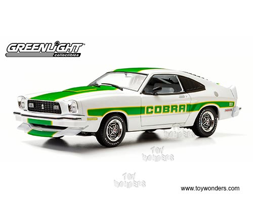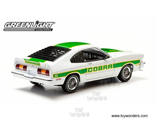 12895 Greenlight - 1978 Ford Mustang II Cobra II Hard Top. 1:18 scale diecast collectible model car. This Ford Mustang II Cobra II is a 9.5"L x 3.75"W x 2.75"H diecast collection car with opening doors, trunk & hood. Limited edition. This 1978 Ford Mustang II Cobra II is manufactured by Greenlight. 12895 is in WHITE with Green stripes. Individually packed in a window box. Box size: 13.25"L x 6.25"W x 5"H.