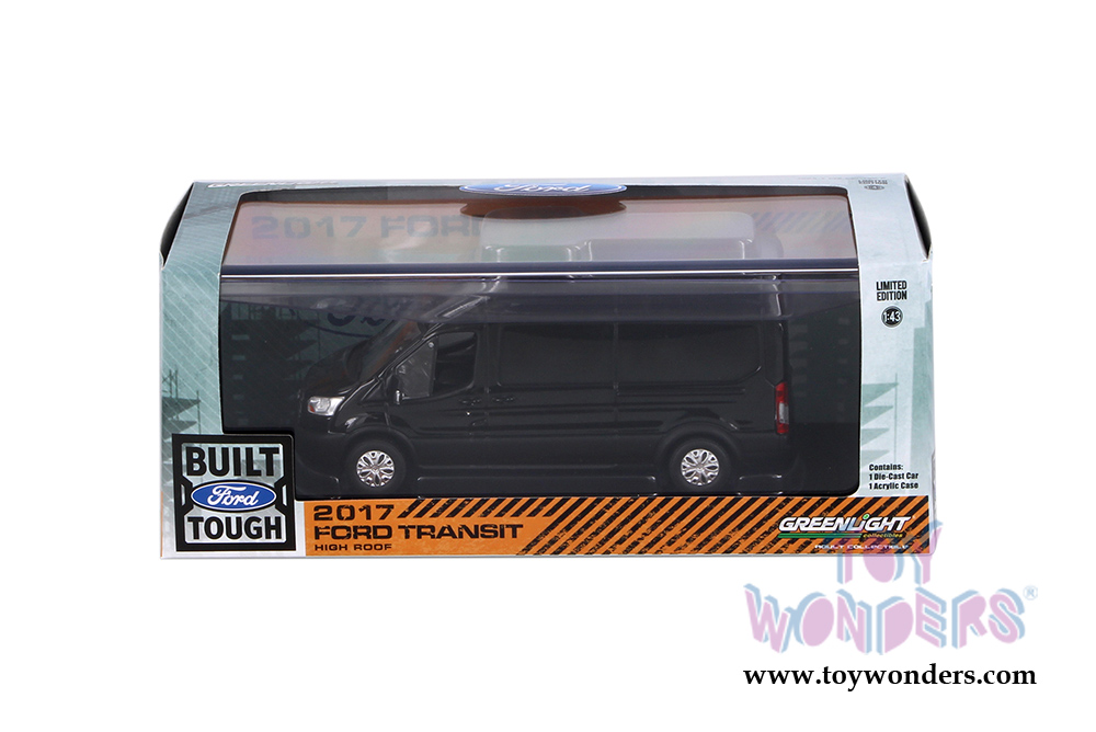 86084 Greenlight - 2017 Ford Transit LWB High Roof Connect Minivan. 1:43 scale diecast collectible model car. This Ford Transit is 5"L x 2"W x 2.5"H authentic detailed replica. Made of heavy weight diecast metal and plastic. Authentic theme packaging, true-to-scale detail, acrylic case. Perfect for customization. Sits on a display plaque. This 2017 Ford Transit Connect is manufactured by Green Light. Item 86084 is in BLACK. Individually packed in a hard acrylic plastic case. Case size: 8"Lx 3.5"Wx 3.25"H. Limited edition.