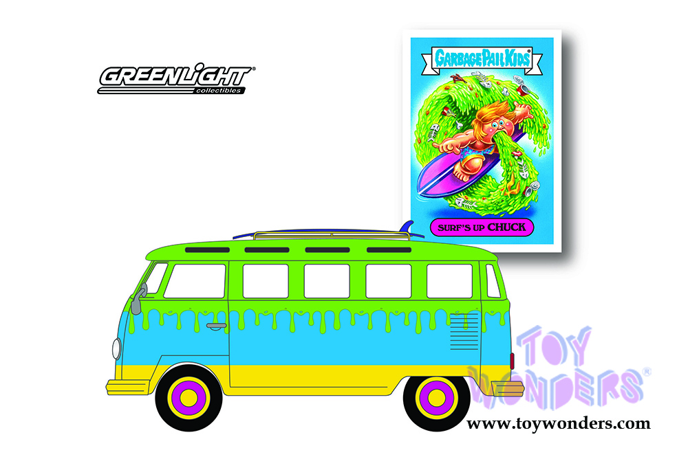Greenlight - Garbage Pail Kids® Series 3 | Volkswagen Samba Bus with Surfboards "Surf's Up Chuck" (1964, 1/64 scale diecast model car, Green/Blue) 54050B/48