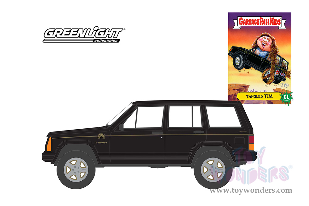 54070F/48 Greenlight - Garbage Pail Kids® Series 4 | 1993 Jeep® Cherokee "Tangled Tim". 1:64 scale diecast collectible model. This Jeep® is a 2.75" long die cast model car. Includes a peel off sticker from the iconic Garbage Pail Kids trading cards. Each car individually blister carded. Card size: 5.75" x 7.75". Manufactured by Greenlight.