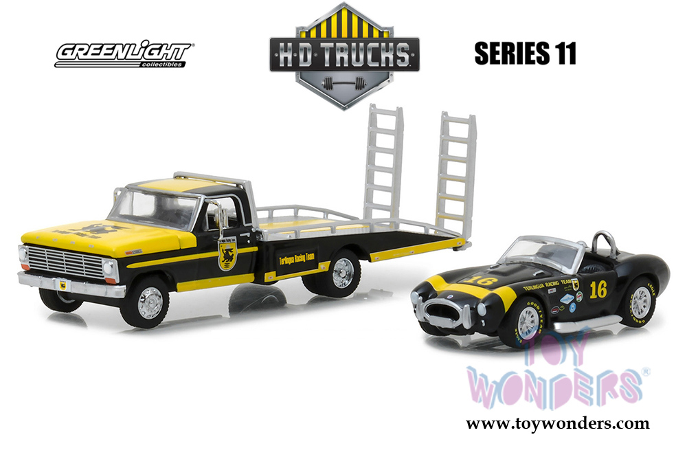 Greenlight - Heavy Duty Trucks Series 11 | Ford F-350 Ramp Truck with Shelby Cobra Terlingua Racing Team #16 (1969, 1/64 scale diecast model car, Black/Yellow) 33110A/48