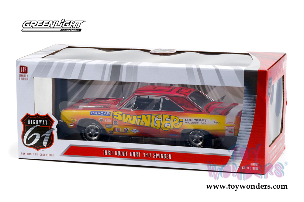 HWY18024 Greenlight Highway 61 - 1969 Dodge Dart 340 - Swinger- Car Craft Project Car. 1:18 scale diecast collectible model. This Dodge Dart is a 10.5"L x 4"W x 2.75"H diecast metal car. Individually packed in a window box. Box size: 12.25"L x 7"W x 6.25"H. Manufactured by Greenlight. Item HWY18024 is in Pink, Red and Yellow graphics.
