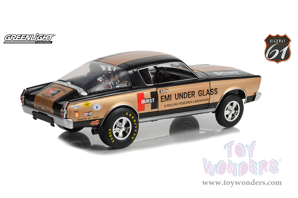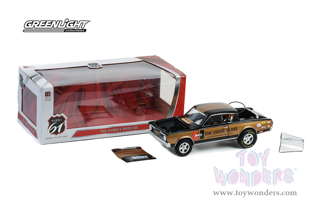 Greenlight Highway 61 - Plymouth Barracuda - Hurst HEMI® Under Glass "A Rolling Research Laboratory" (1966, 1/18 scale diecast model car, Gold/Black) HWY18034