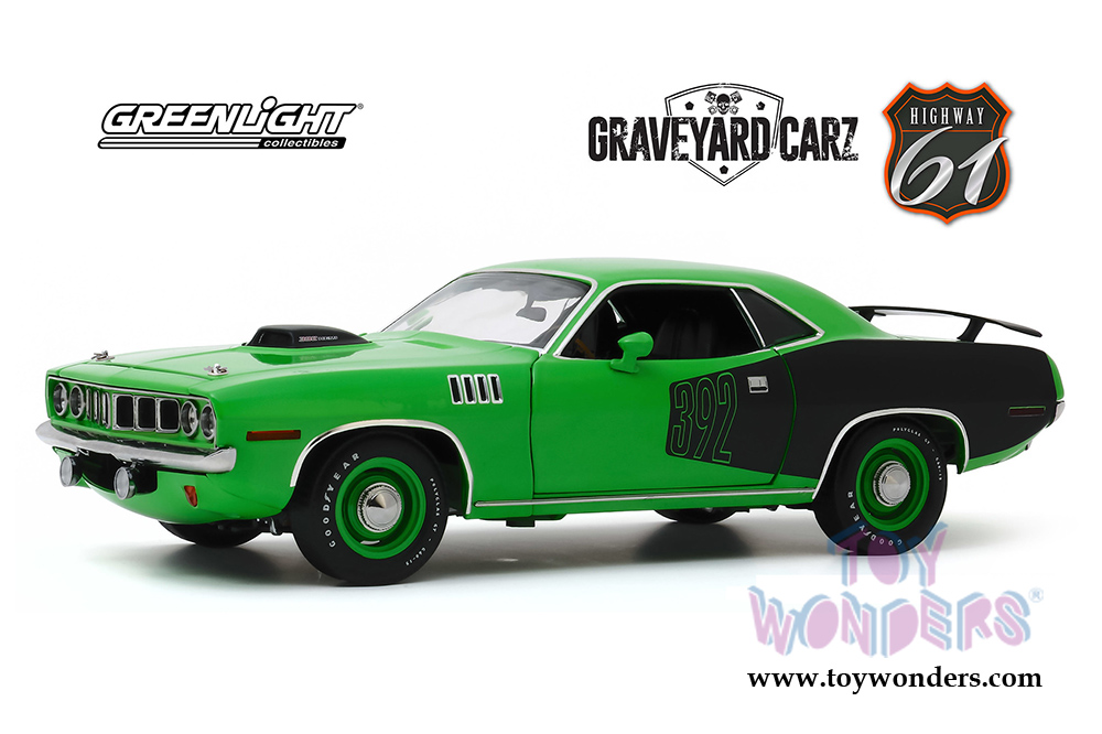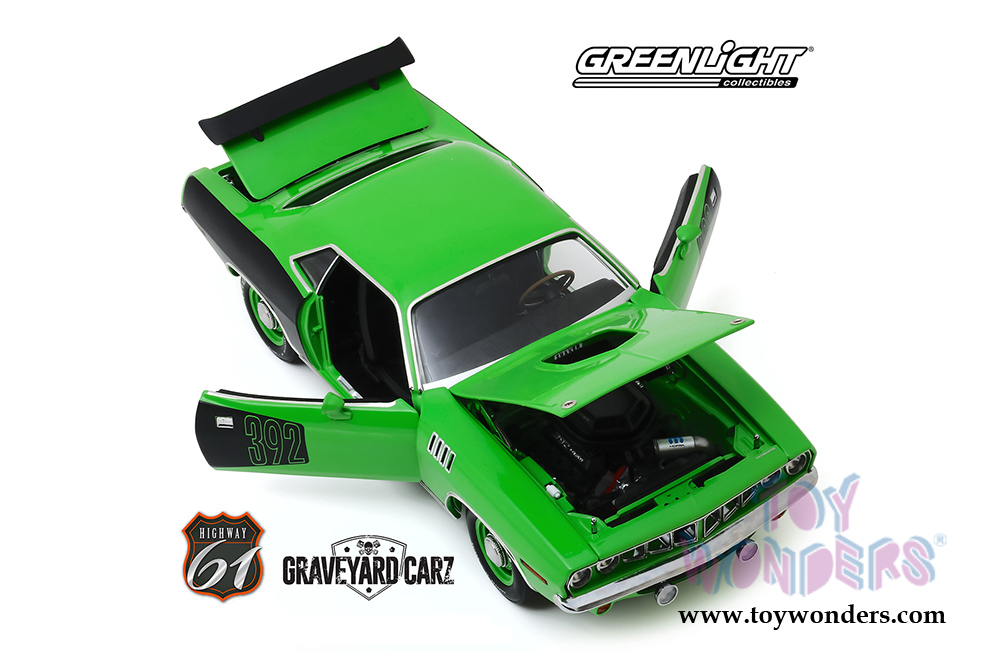 Greenlight Highway 61 - Plymouth 'Cuda with Custom Crate 392 HEMI Engine (2016 SEMA Show Unveil) Graveyard Carz (2012-Current TV Series) (2016, 1/18 scale diecast model car, Bright Green/Black) HWY18017