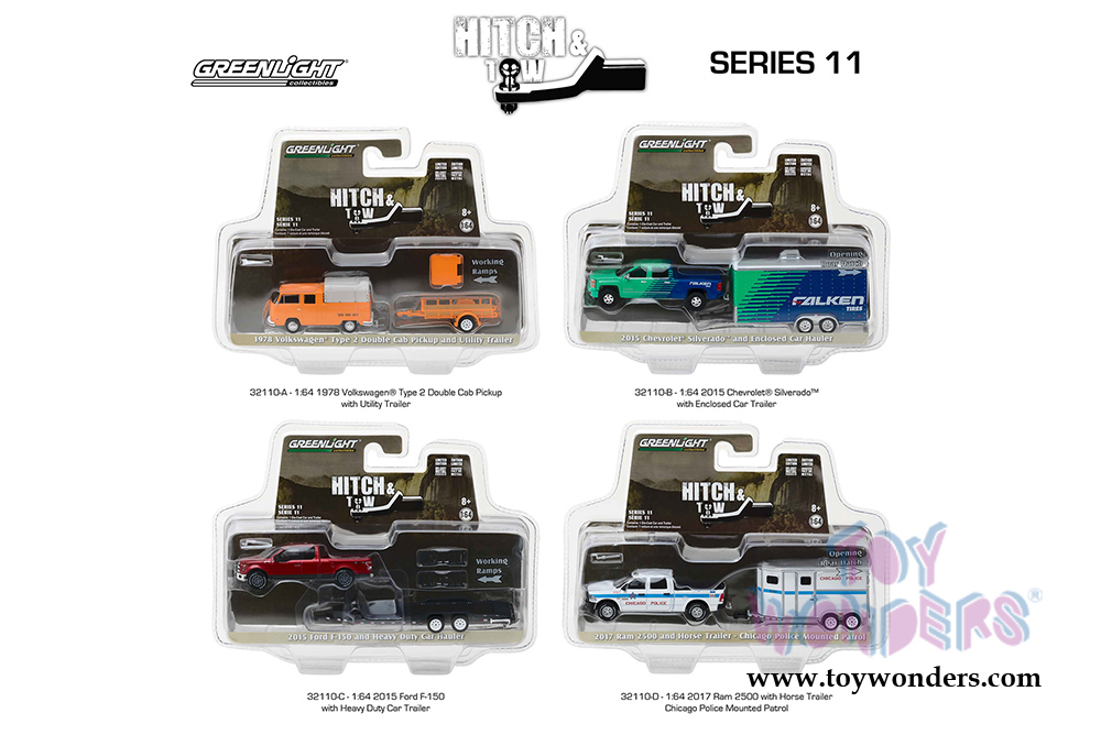 32110/48 Greenlight - Hitch & Tow Series 11 assortment (6 pcs. set). 1:64 scale diecast collectible model cars. These cars are about 3" to 3.5" long as well as the trailers/haulers. 6 pc set, limited edition. Each car individually blister carded. Card size: 8.5" x 6.5". These cars are manufactured by Greenlight. Limited Edition. Item 32110/48 is in assorted colors.