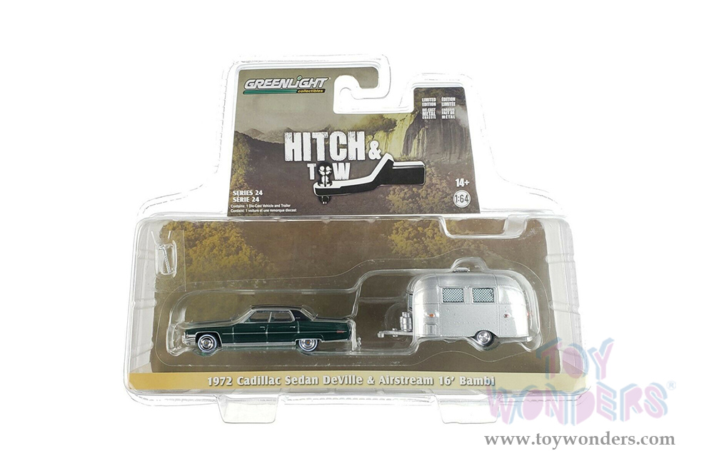 Greenlight - Hitch & Tow Series 24 | Cadillac Sedan DeVille & Airstream 16' Bambi (1972, 1/64 scale diecast model car, Brewster Green Metallic) 32240A/24