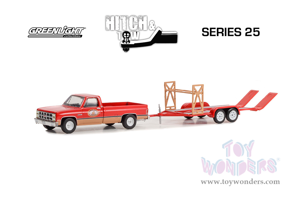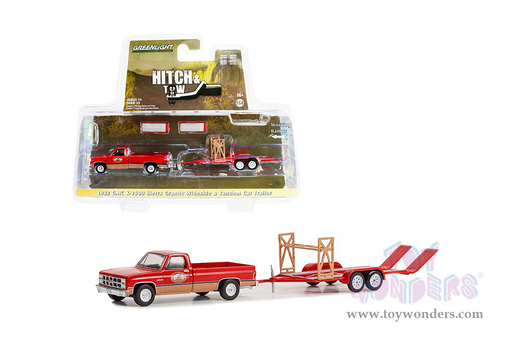 Greenlight - Hitch & Tow Series 25 | GMC® K-2500 Sierra Grande Wideside Pickup Truck Busted Knuckle Garage and Tandem Car Trailer (1982, 1/64 scale diecast model car, Red and Beige) 32250B/24