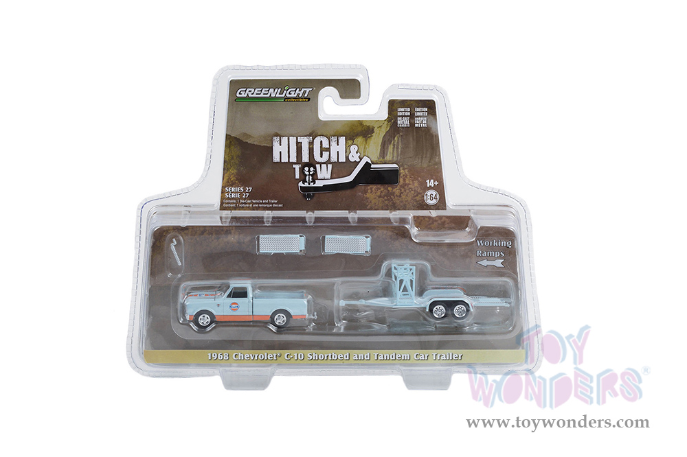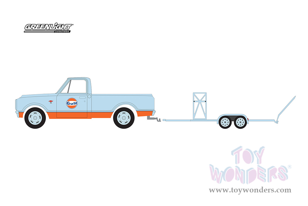 Greenlight - Hitch & Tow Series 27 | Chevrolet® C-10 Shortbed Pickup Truck and Tandem Car Trailer "Gulf Oil" (1968, 1/64 scale diecast model car, Light Blue/Orange) 32270A/24