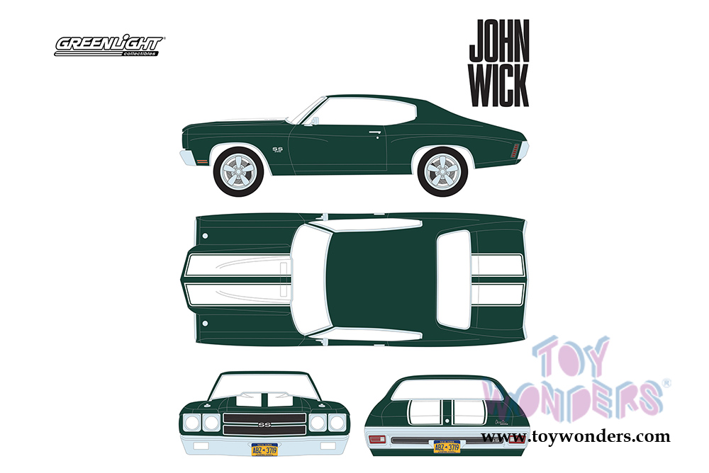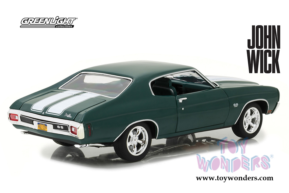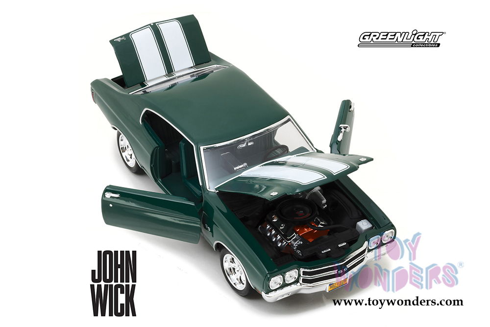 13505 Greenlight Hollywood - 1970 Chevrolet® Chevelle® SS™ 396 - John Wick Hard Top (2014 movie). 1:18 scale diecast collectible model car. This '70 Chevy Chevelle is a 10.5"L x 4"W x 3"H diecast collection car. This Chevrolet Chevelle SS is manufactured by Greenlight. Limited Edition, adult collection. 13505 is in Metallic GREEN color. Individually packed in a window box. Box size: 13"Lx 6.25"Wx 5.25"H.