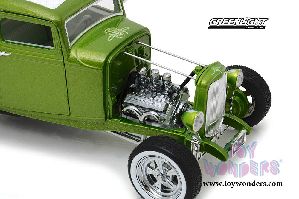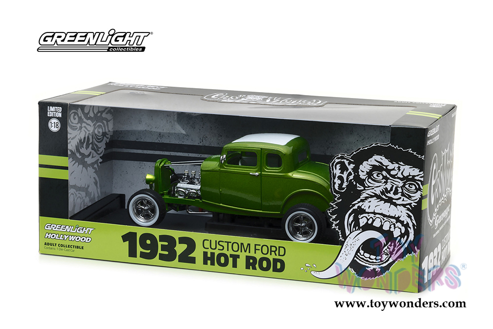 12974 Greenlight Hollywood - 1932 Custom Ford Hot Rod Gas Monkey Garage (2012 TV Series). 1:18 scale diecast collectible model. This Ford is an 8.5"L x 4"W x 3"H diecast model car. GreenLight Hollywood takes iconic film and television vehicles from both the past and present and brings them to life with four-wheeled diecast replicas. Limited edition. Item 12974 is in Metallic GREEN color. Individually packed in a decorated Box. Box size: 14"Lx 6.5"Wx 5.5"H.
