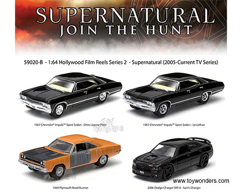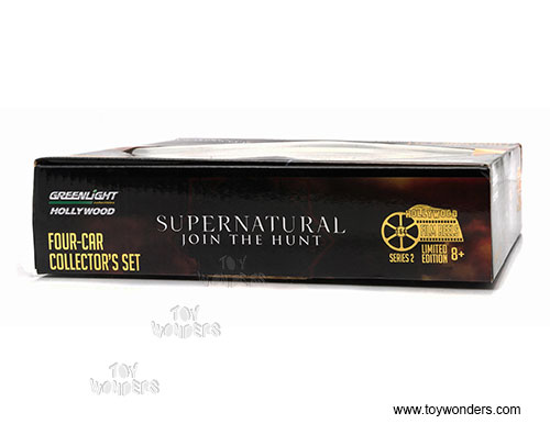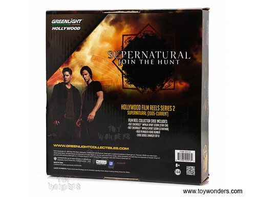 59020B Greenlight - Hollywood Film Reels Series 2 - Supernatural (2005 - current TV Series). GreenLight has put the love of the silver screen into something slightly smaller with 1:64th scale replicas. Greenlight Hollywood takes iconic film and television vehicles from both the past and present and brings them to life with four-wheeled diecast replicas. 1:64 scale diecast collectible model. These cars are 3" long die cast model cars. Beautifully placed in a 7.75" tin canister that resembles the old film reel containers. These chrome reels are inside a box. Box size: 8.5" x 8.5". Manufactured by Greenlight.