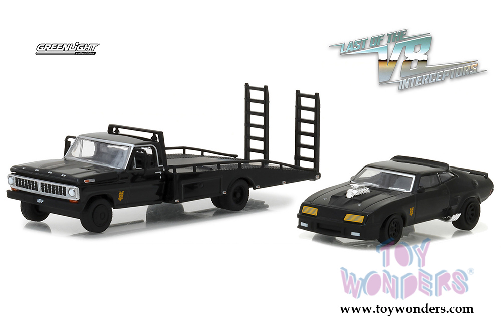 Greenlight Hollywood - Last of the V8 Interceptors (1979) 1972 Ford F-350 Ramp Truck with 1973 Ford Falcon XB (1972, 1973, 1/64 scale diecast model car, Black/White) 29925/48