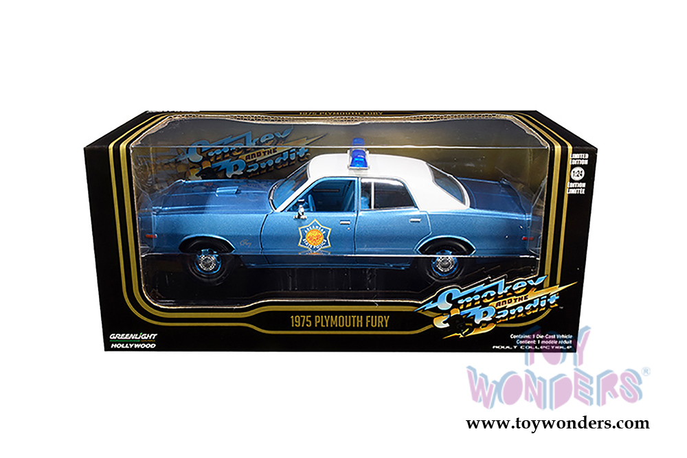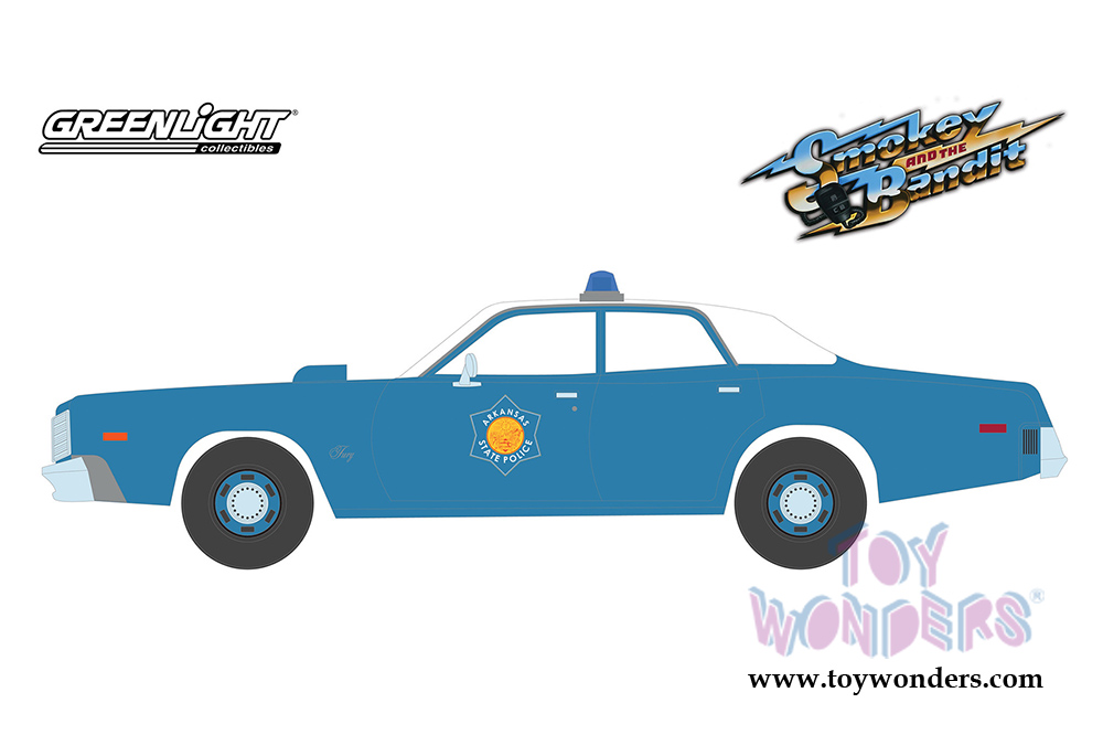 84102 Greenlight Hollywood - 1975 Plymouth Fury Police Pursuit Arkansas State Police "Smokey and The Bandit". 1:24 scale diecast collectible model car. This Plymouth Fury is a 9"L x 3.25"W x 2.75"H diecast collection car with openable doors, detailed interior and exterior. This 1975 Plymouth Police is manufactured by Green Light. Item 84102 is in Blue with white top. Individually packed in a movie themed window box. Box size: 9.5"L x 4.5"W x 4.25"H.