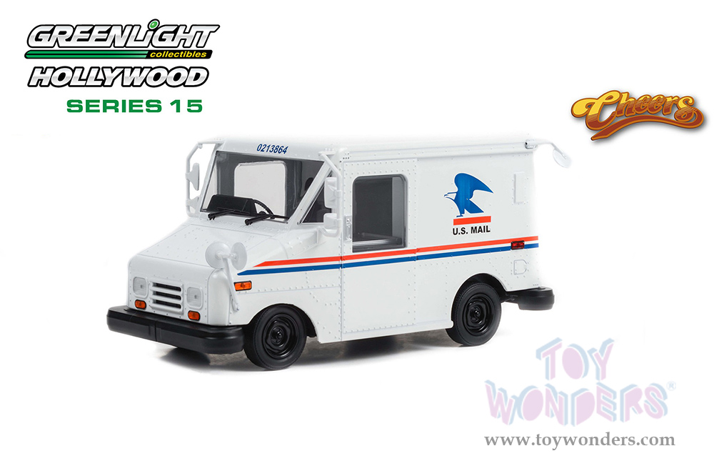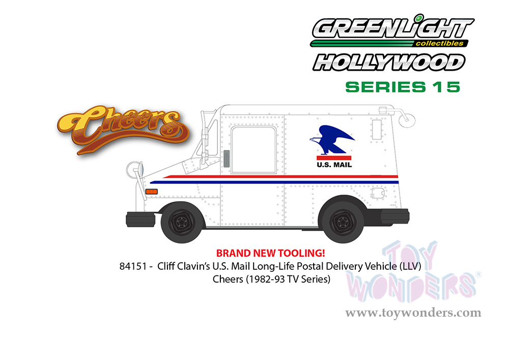 84151 Greenlight Hollywood Series 15 | U.S. Mail Long-Life Postal Delivery Vehicle (LLV) (Cliff Clavin's) "Cheers" (1982-1993) TV Series. 1:24 scale diecast collectible model car. This Delivery Vehicle is a 7.25"L x 4.25"W x 3.5"H diecast collection car with openable rear doors, detailed interior and exterior. This U.S. Mail Truck is manufactured by Green Light. Item 84151 is in White. Individually packed in a movie themed window box. Box size: 9.5"L x 4.5"W x 4.25"H.
