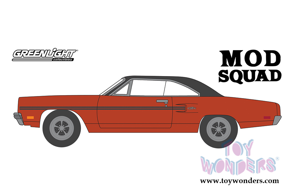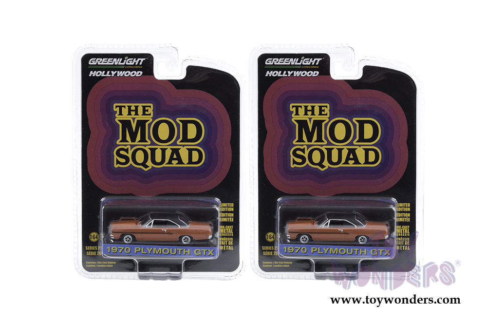 44890A/48 Hollywood Series 29 | 1970 Plymouth GTX Hardtop - The Mod Squad (TV Series, 1968-73). Greenlight has put the love of the silver screen into something slightly smaller with 1:64th scale replicas. Greenlight Hollywood takes iconic film and television vehicles from both the past and present and brings them to life with four-wheeled diecast replicas. 1:64 scale diecast collectible model. This Plymouth Vehicle is 3" long diecast model cars. Each car individually blister carded. Card size: 5.75" x 7.75". Manufactured by Greenlight.